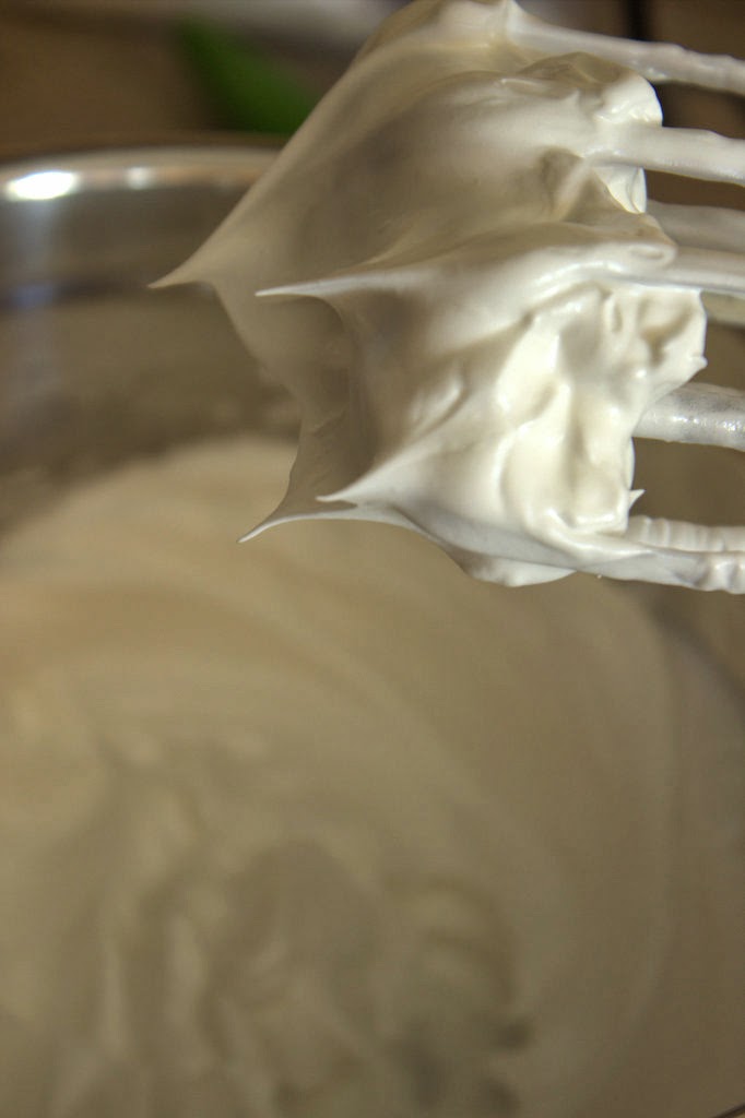 Add sugar, 1 tablespoon at a time and beat on medium high heat till stiff peak forms. You know its ready when stiff peak forms and little batter between your fingers feels smooth, which means the sugar has dissolved.