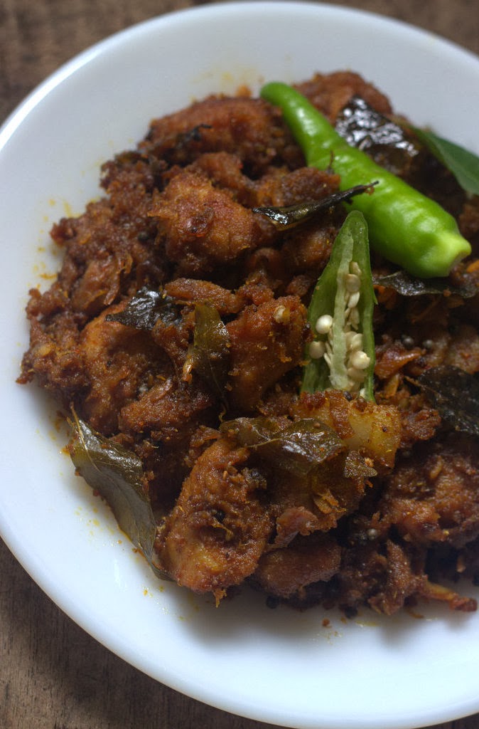 Heat oil in a pan on medium heat. Add mustard seeds. Once it cracks, add onions + curry leaves + garlic and saute. If needed, you can add 1/2 teaspoon red chilly powder and 1/2 teaspoon garam masala into the oil, taking care that the spices don't burn. Add the cooked pork and saute for another 10-15 minutes until slightly crisp and till the pork gets coated with oil and spices.